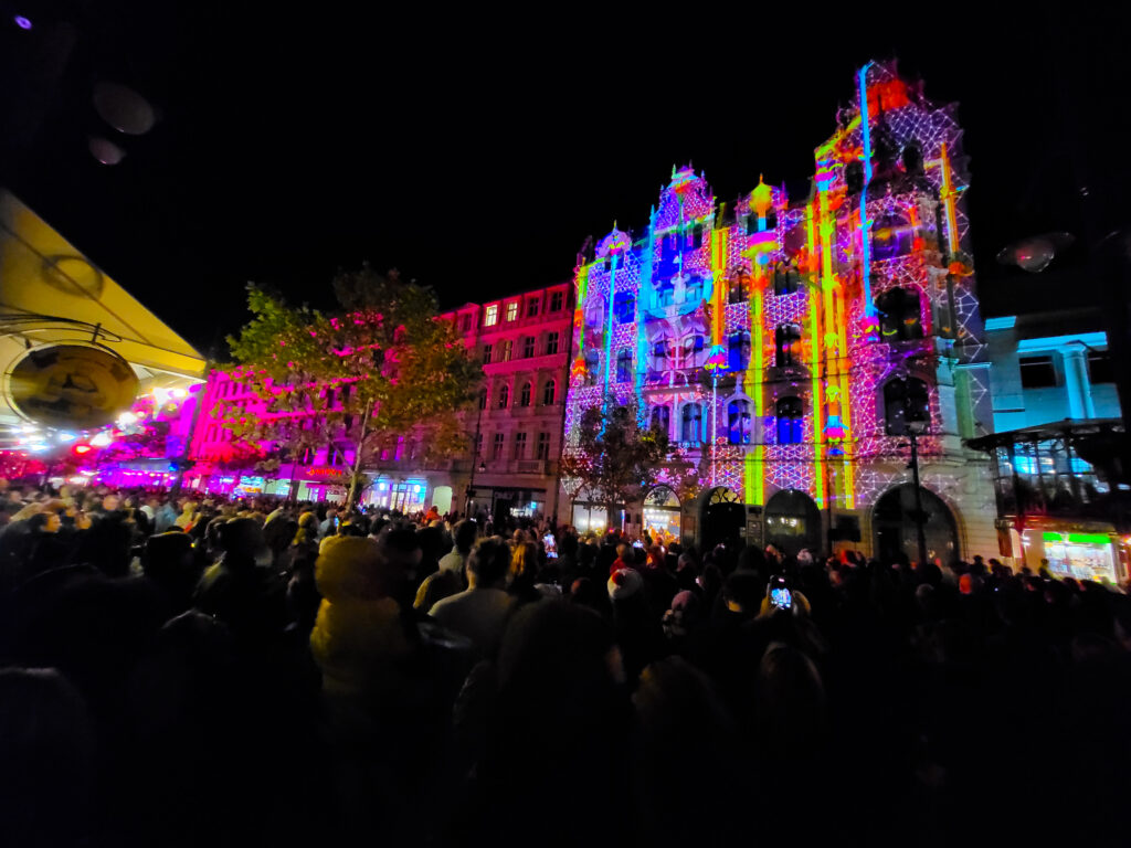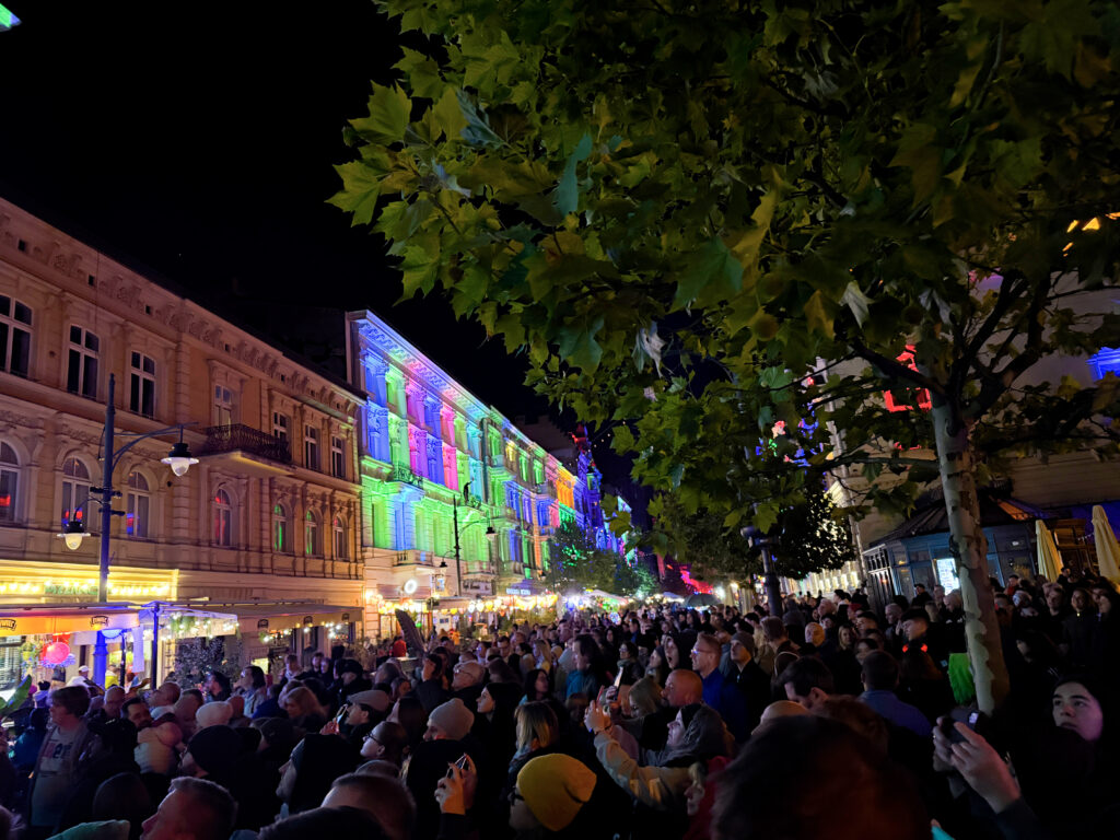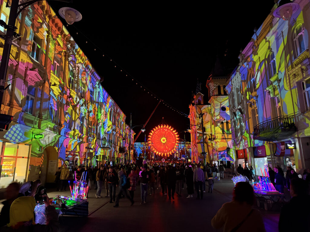 Aby zobaczyć tegoroczne światło wybrałem się na długi – bo blisko 4 godzinny spacer – główną ulica miasta już w piątkowy wieczór – w pierwszym dniu festiwalu, sądząc, że będzie mniej ludzi. Niestety się pomyliłem. Tłumy, tłumy ludzi w różnym wieku, którzy przyszli, przyjechali spoza miasta, aby podziwiać miasto rozświetlone tysiącem świateł.
