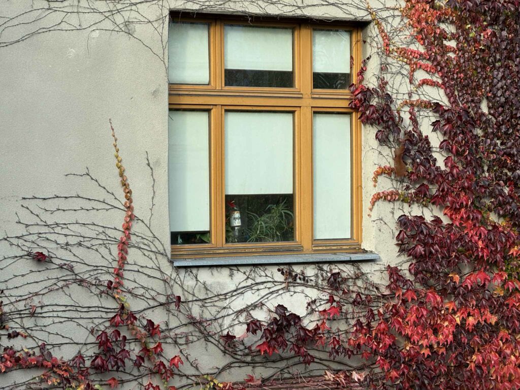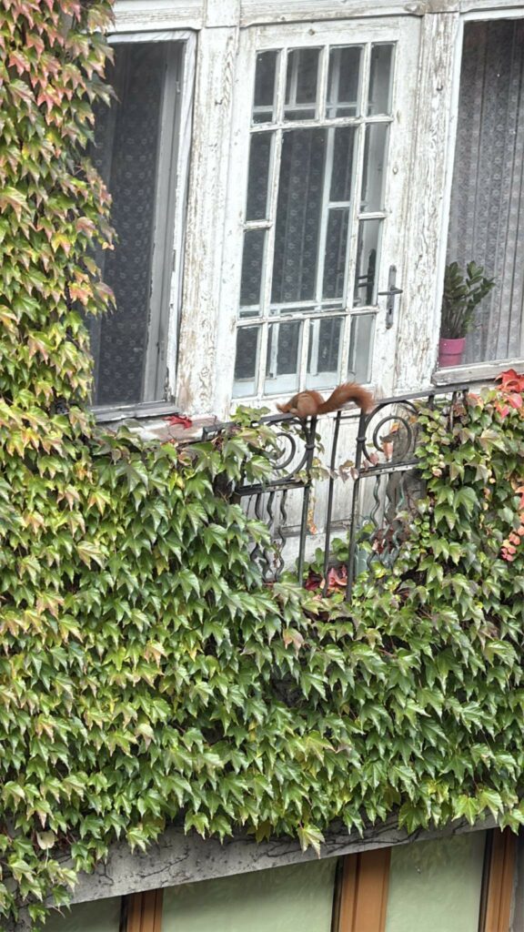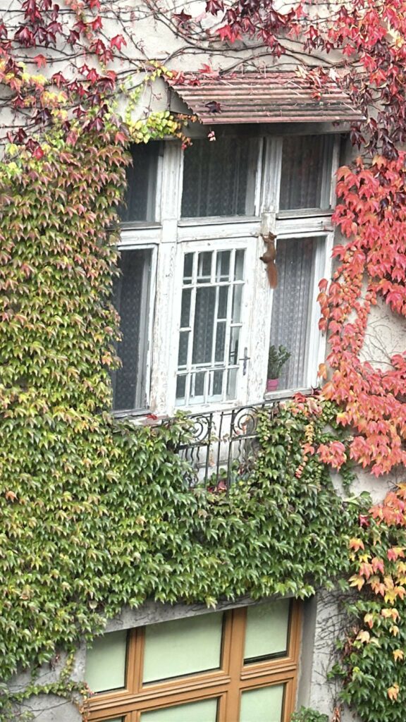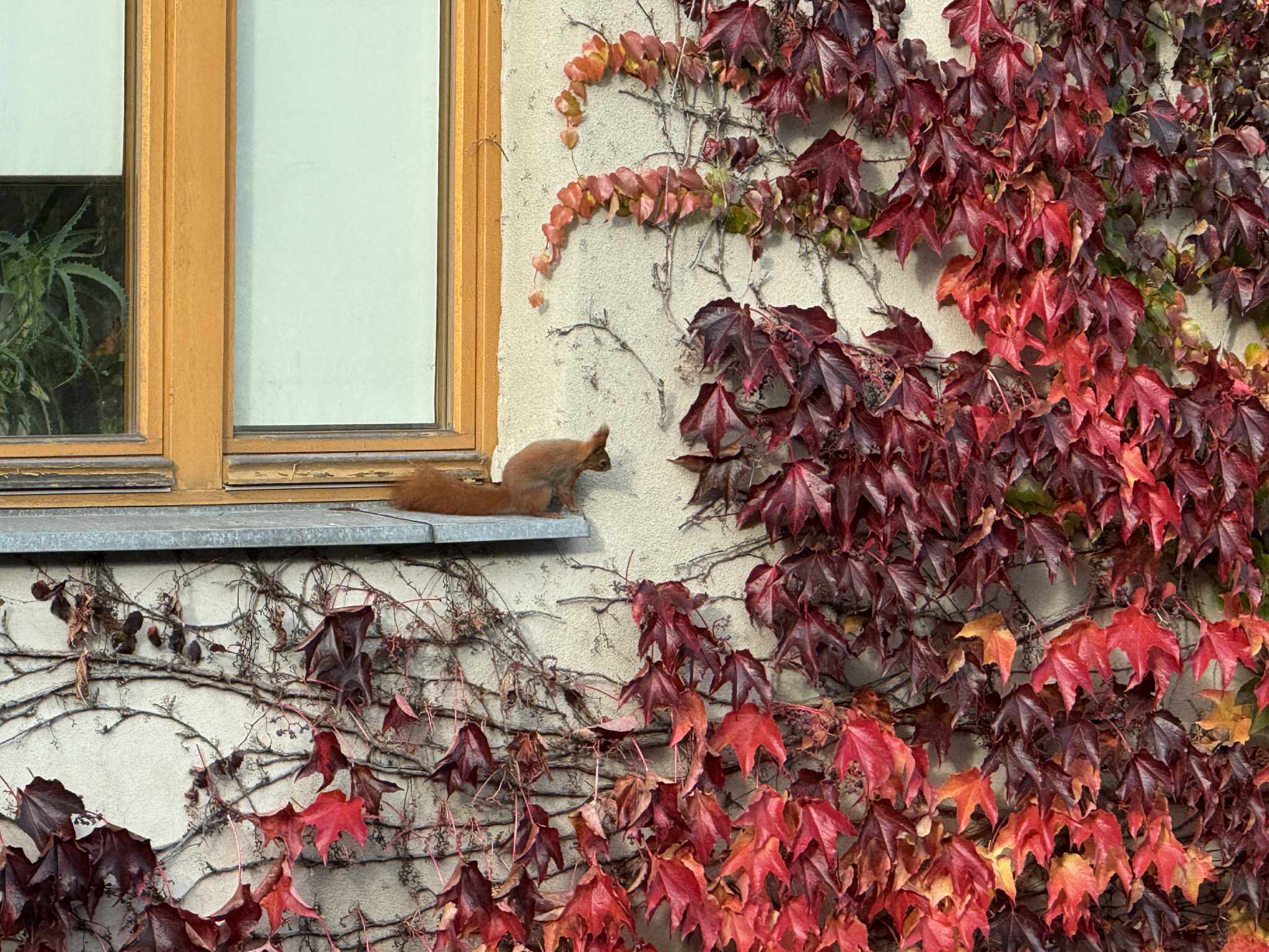 Szybko chwyciłem za telefon i nagrałem krótki filmik, w którym doskonale widać jak wiewiórka biega sobie po elewacji kamienicy porośniętej dziką winoroślą, która – teraz w tym czasie – wybarwia się kolorami jesieni.