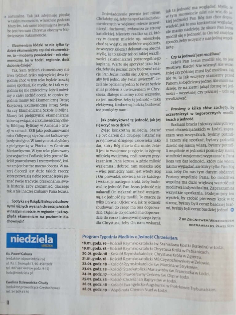 W ostatnim numerze Tygodnika Katolickiego Niedziela znalazł się mój wywiad z biskupem administratorem mojej diecezji na temat ekumenizmu w Kościele. Temat ten został wybrany w kontekście zbliżającego się Tygodnia Modlitw o Jedność Chrześcijan, który obchodzony jest w Kościele w drugiej połowie stycznia. Zachęcam do lektury!
