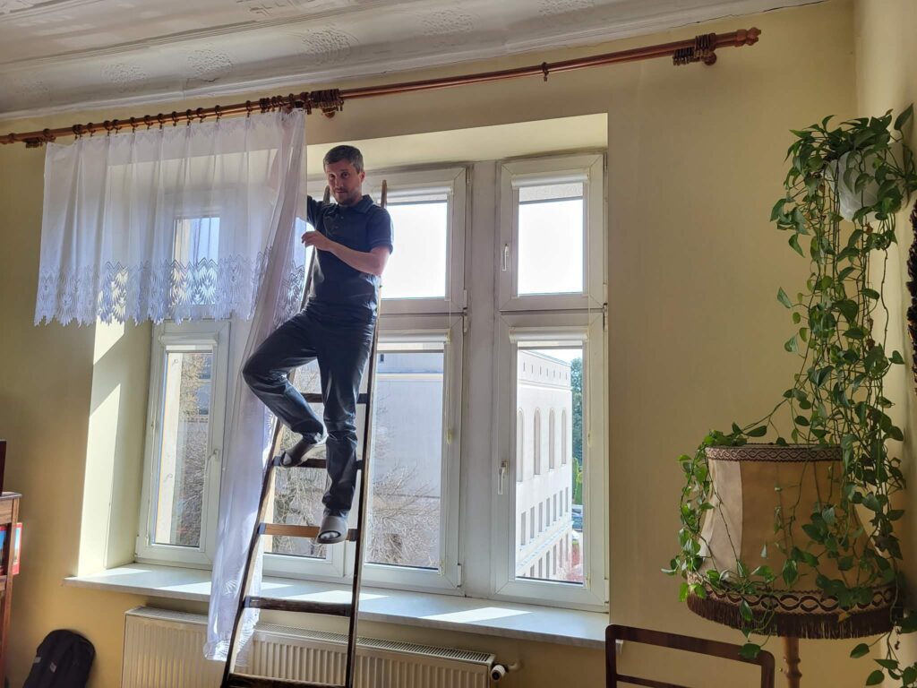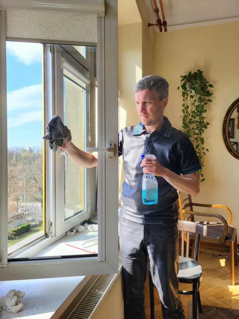 Najpierw zdjąłem firany i zasłony oraz serwetki, po zamoczeniu trafiły do pralki. Następnie umyłem okna i parapety, a gdy firany i zasłony się wyprały, trafiły na czyste okna. Następnie odkurzenie, ścieranie kurzu, mycie podług oraz łazienki i kuchni. Potem drobne prasowanie koszul, alby, obrusów i serwetek.