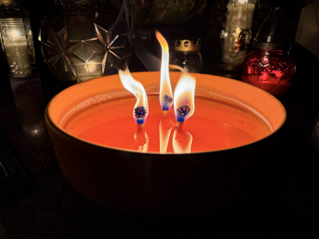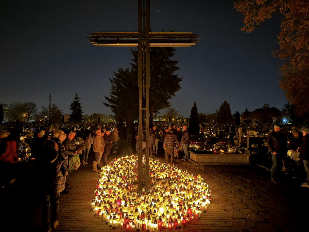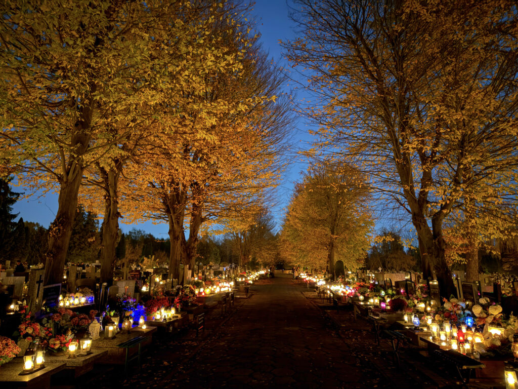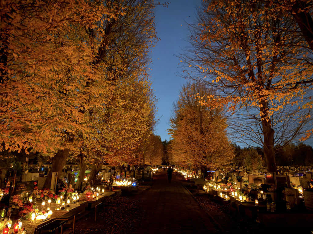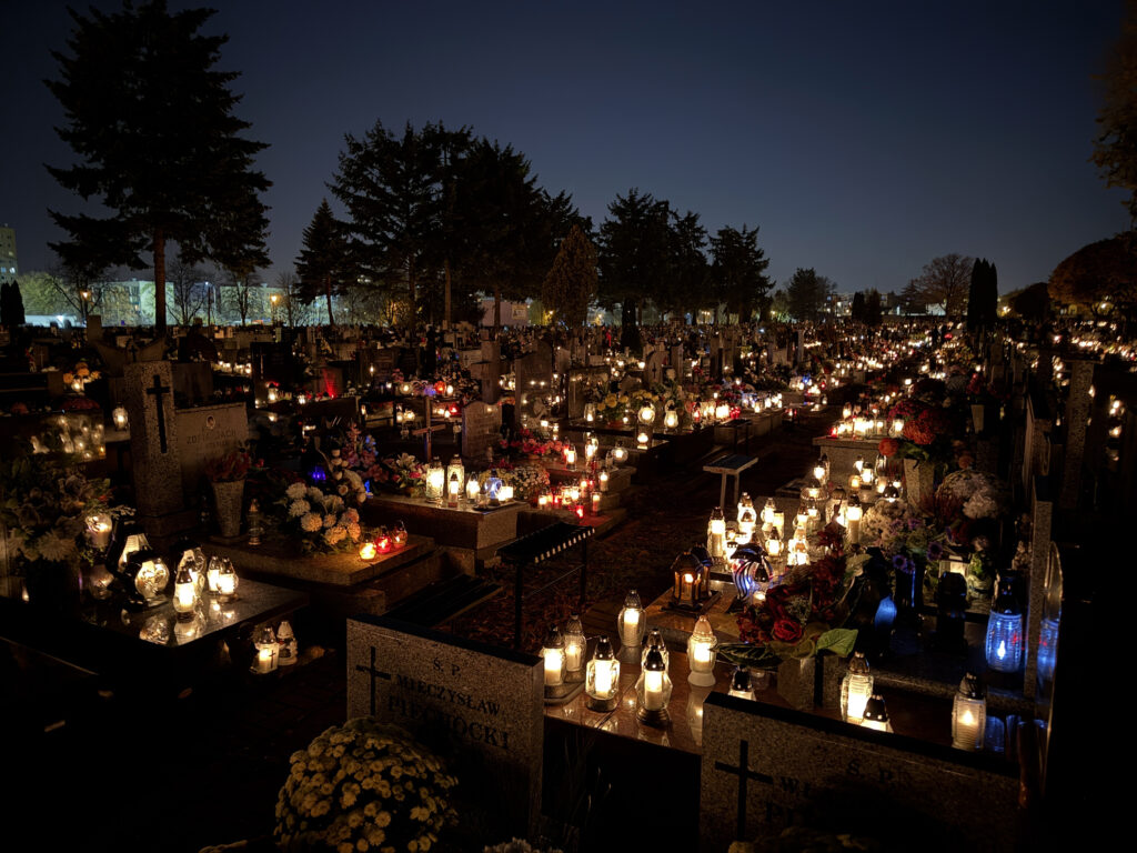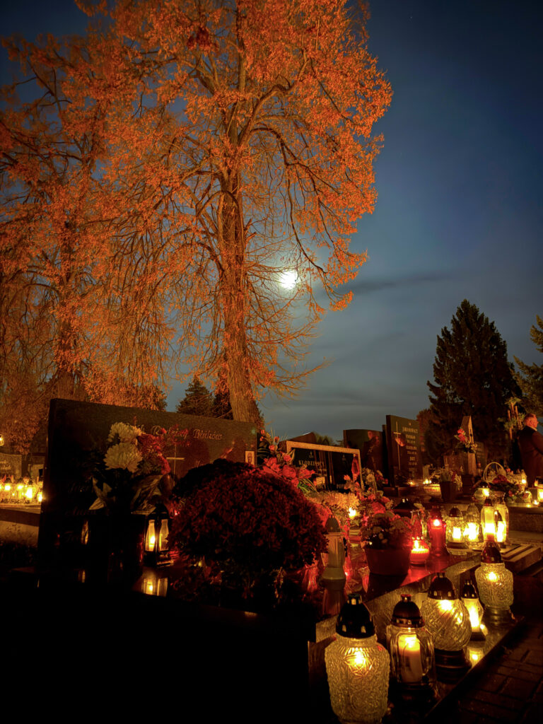 W samą uroczystość Wszystkich Świętych pojechałem na cmentarz do dziadków i pradziadków przed moją posługą parafialną, tzn. byłem tam przed wschodem słońca – tzn. przed godz. 6:00. Wszedłem na cmentarz – po którym już kręcili się przechodnie – zapaliłem znicze, odmówiłem różaniec za zmarłych i zrobiłem kilka fotografii.